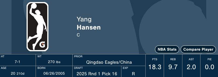2025年NBA选秀可谓星光熠熠,中国球员杨瀚森受到出场时间的限制没能在常规赛中收获亮眼的数据,截至目前杨瀚森出战25场比赛,在场均8.4分钟的出场时间中能够收获2.4分1.6篮板和0.8助攻。但教练组现如今更多的安排他出战开拓者下属球队波特兰混音队的比赛,而杨瀚森在发展联盟的表现和场均数据则要出色的多,场均18.3分9.7篮板2助攻个的“准两双”数据,对于平日需要辗转开拓者和混音队的杨瀚森而言已是不易。