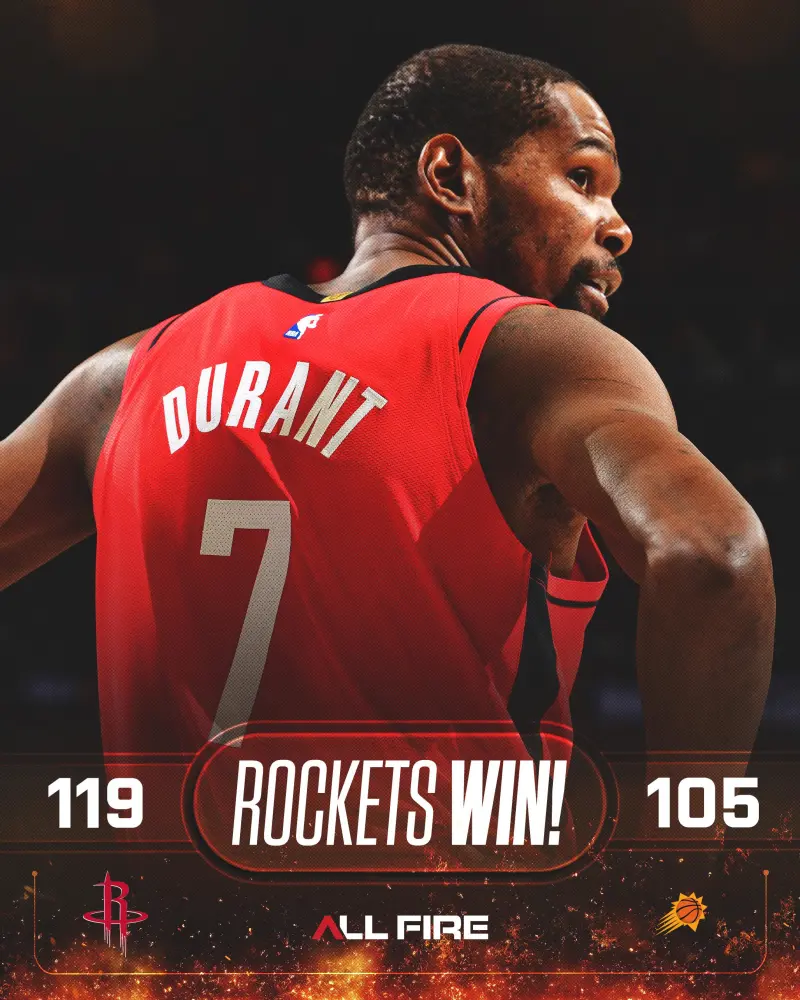 火箭开局遭太阳打出 24-0 恐怖攻势,首节落后 21 分陷入绝境;第二节杜兰特三记三分硬咬比分,带队将分差缩小至 3 分;第三节申京早早领到 4 犯下场,年轻人顶住压力稳住局势;第四节申京回归救赎,单核带队反超收割,杜兰特第四节仅打 5 分钟轻松打卡,赛后直言这是他本赛季最爱的胜利之一。